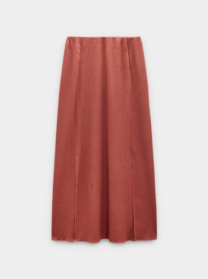 חצאית ארוכה עם אפקט מקומט. גזרה מתרחבת. מותן אלסטי. שסעים נמוכים בחלק הקדמי. הדוגמנית בגובה 1.75 מ' ולובשת מידה XS-S.
