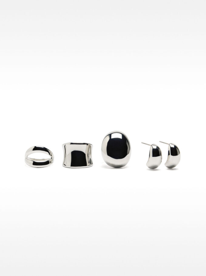 סט של שלוש טבעות רחבות וזוג עגילים: טבעות בצורת אליפסה, קמורות ובעלות מראה כפול וזוג עגילים בצורת טיפה. גימור כסוף.
