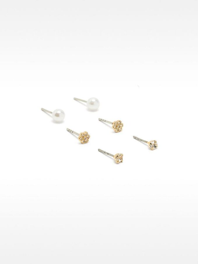 סט של שלושה עגילים קצרים עם זירקונים ופנינה. גימור מוזהב.