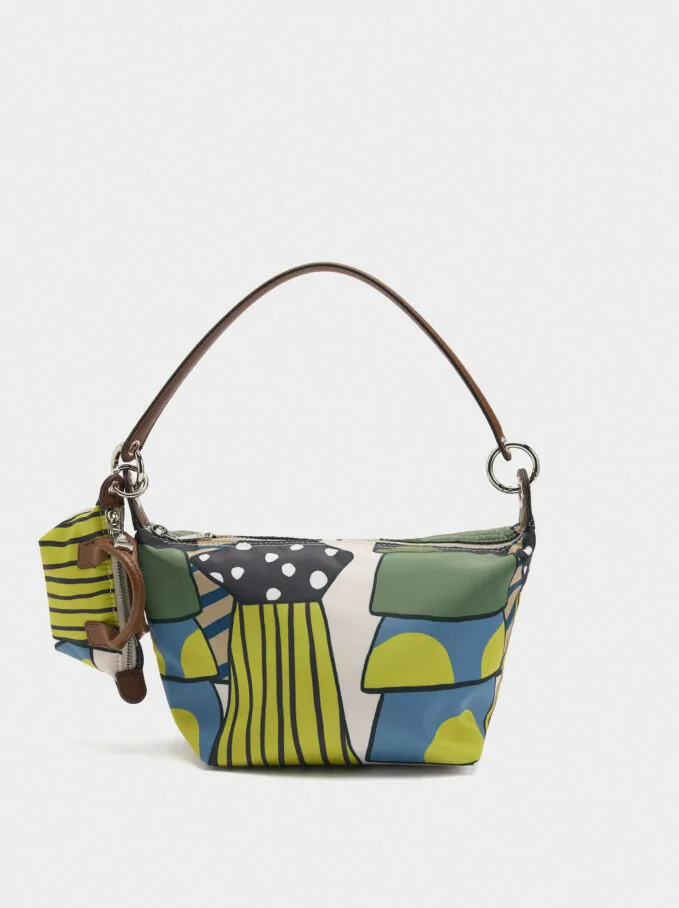 תיק כתף מניילון מודפס בגודל בינוני. תליון בצורת תיק מיני. בטנה וכיס פנימי. סגירת רוכסן. רצועת כתף נשלפת. כולל רצועת תיק צד מתכווננת.